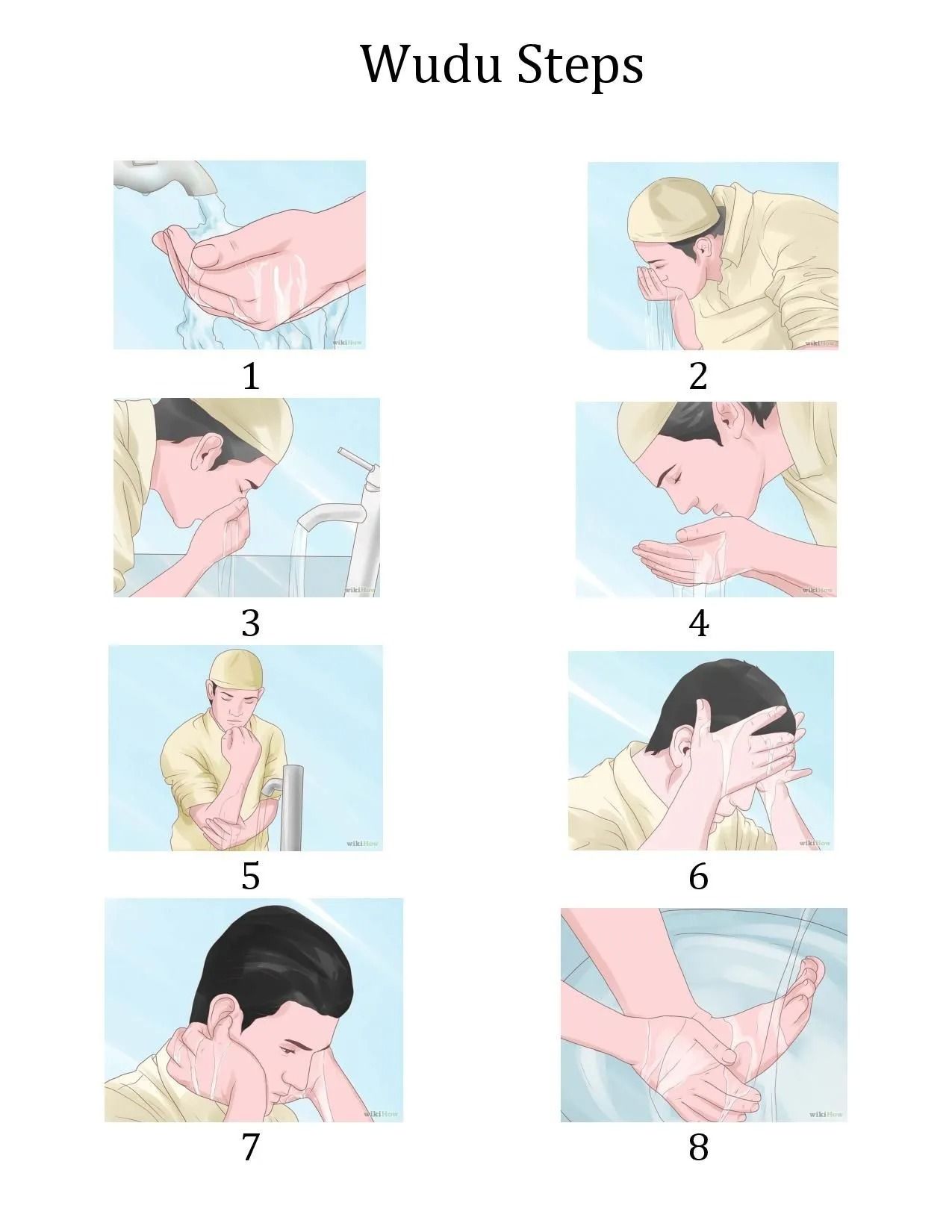 Quietly to yourself make niyyah, (intention) to perform wudu and say "Bismillah" {In the Name of Allah} before starting wudu.